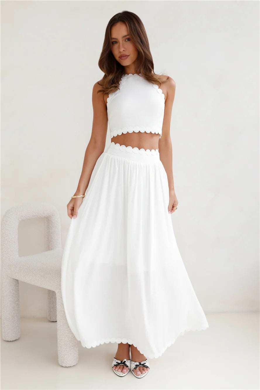 Your reason to shop is here, lovely! The Linked Together Crop Top features a gorgeous embroidered white trim that's unique and stylish! Pair with the matching skirt for a fun 'fit.