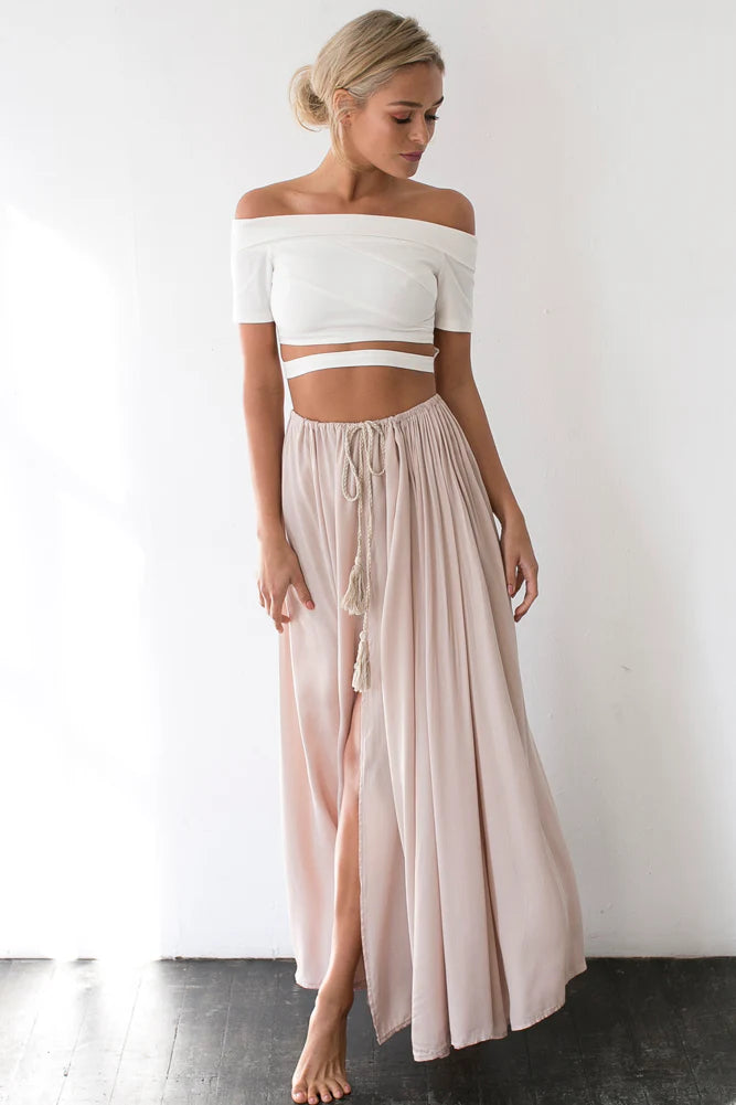 Against The Tides Maxi Skirt NudeTop.Not lined.Cold hand wash only.Model is standard S and is wearing S.True to size.Non stretchy fabric.Polyester.