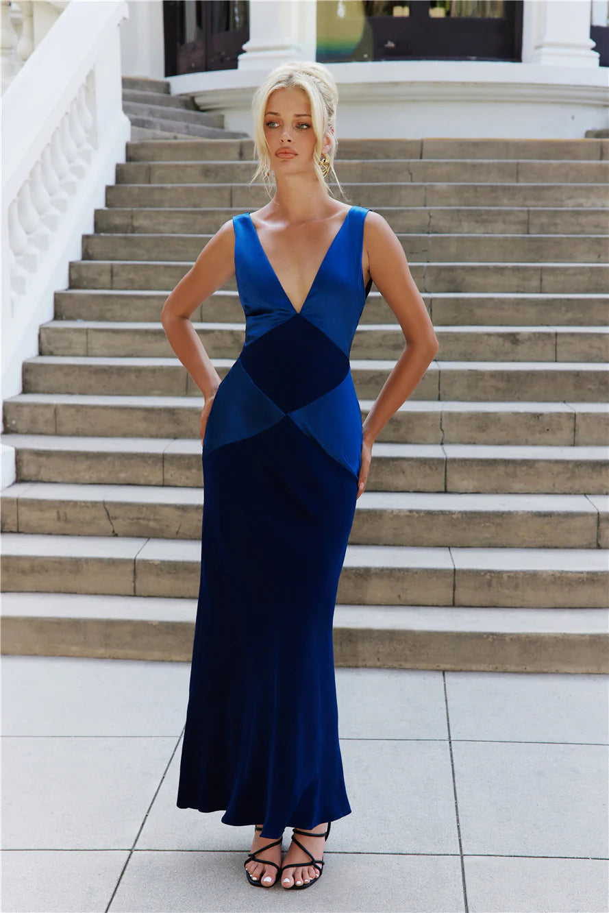 RSVP yes, lovely, because you've found the perfect dress for your event. The Subtle Splendor Satin Maxi Dress features contrast satin panels, a V-neck and a gorgeous straight, flowy silhouette. Style with heels and curls.