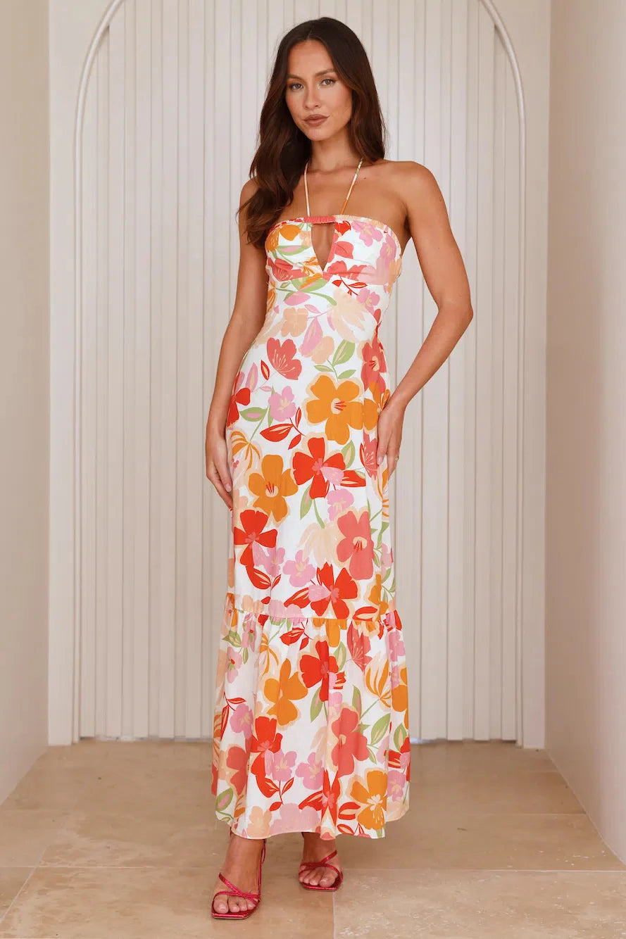 Lovely, this is a summertime essential. The Surfside Escape Halter Maxi Dress features an elastic neckline and back, a halter tie and a gorgeous flowy silhouette. Style with sandals and curls.